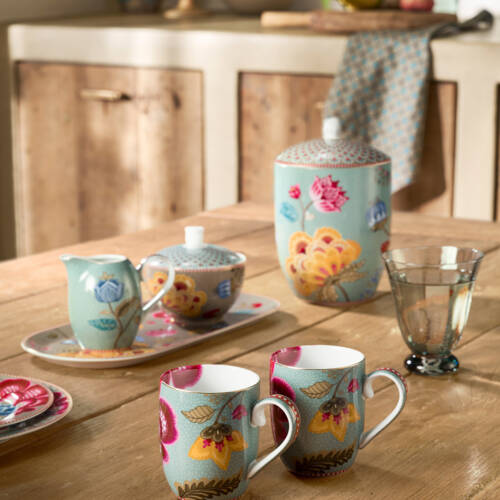 Dizajn Blooming Tales je plný hravosti a pestrých farieb. Na modrom pozadí nádherne vynikajú veľké kvetinové vzory. Kolekcia ponúka aj úchvatný dlaždicový motív, ktorý sa skladá z bielych a červených bodiek na modrom podklade. Dizajn dopĺňajú zlaté detaily. Hoci Blooming Tales nesie charakteristické črty štýlu Pip Studio, prináša aj svoju vlastnú jedinečnosť.