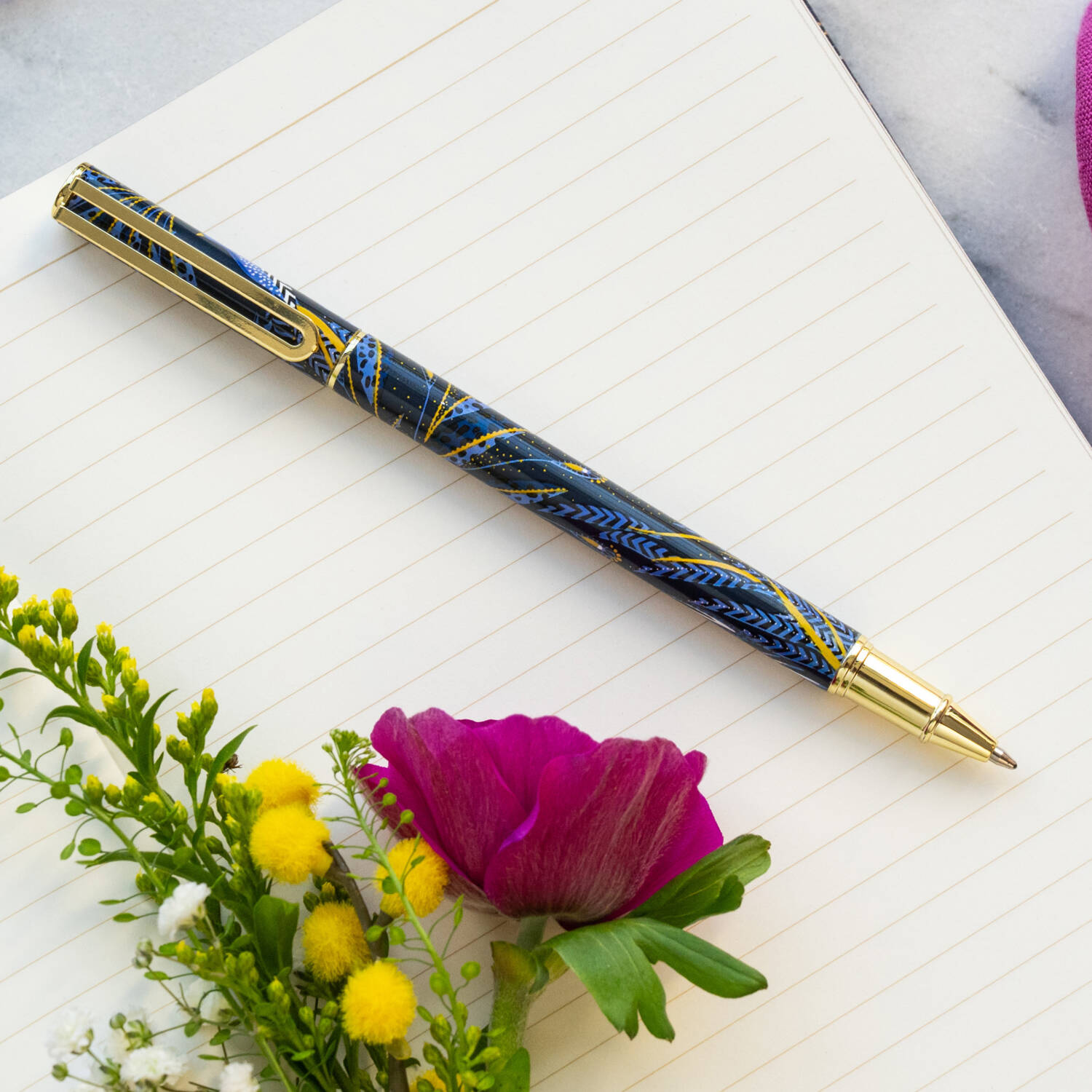 Guličkové pero Peacock Parade je pôsobivou kombináciou umeleckého dizajnu a funkčnosti. Rozprestreté pávie perá sa rozprestierajú na bohatom indigovom pozadí, zdobenom trblietavými zlatými detailmi, ktoré dodávajú luxusný nádych. Toto prémiové pero, elegantne zabalené v štýlovej krabičke, je ideálnym sofistikovaným darčekom alebo šik doplnkom na váš stôl alebo do kabelky. Vďaka bezpečnému uzáveru a nadčasovému dizajnu premení každodenné písanie na moment elegancie a štýlu.