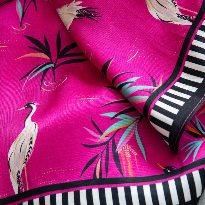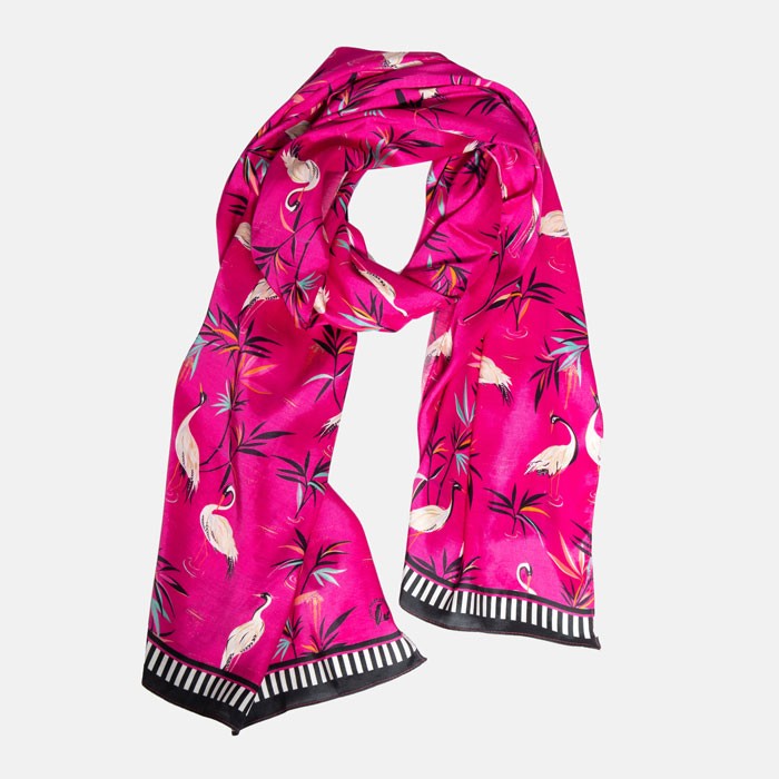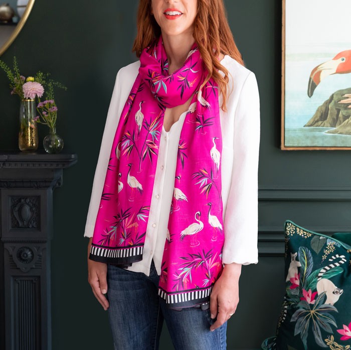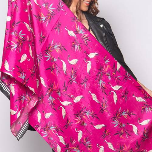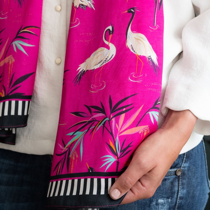 Dodajte svojmu každodennému životu výraznú farbu s touto žiarivou ružovou šatkou od Sary Miller London. Oživte svoj outfit týmto odvážnym a univerzálnym šálom z modalovej zmesi s krásnym tropickým vzorom.