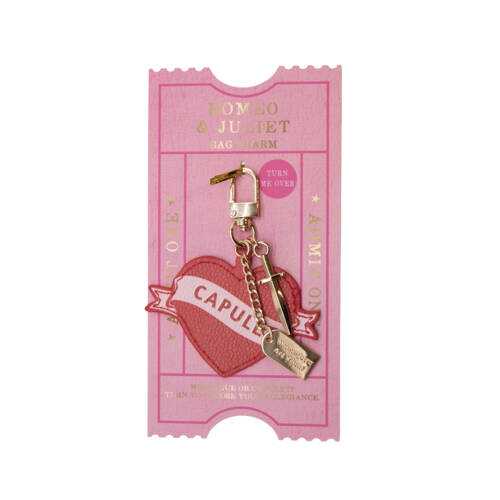 Tento prívesok na tašku v tvare srdca z polyuretánu je inšpirovaný Shakespearovou nesmrteľnou hrou Romeo a Júlia. Má obojstranný dizajn a je doplnený jemným príveskom v tvare zlatej dýky a kovovou visačkou s vyrytým ikonickým citátom „Wherefore art thou“. Doplnok je zakončený klipom na kľúče. Je to romantický a univerzálny doplnok na akúkoľvek tašku, kabelku alebo ako kľúčenka.
