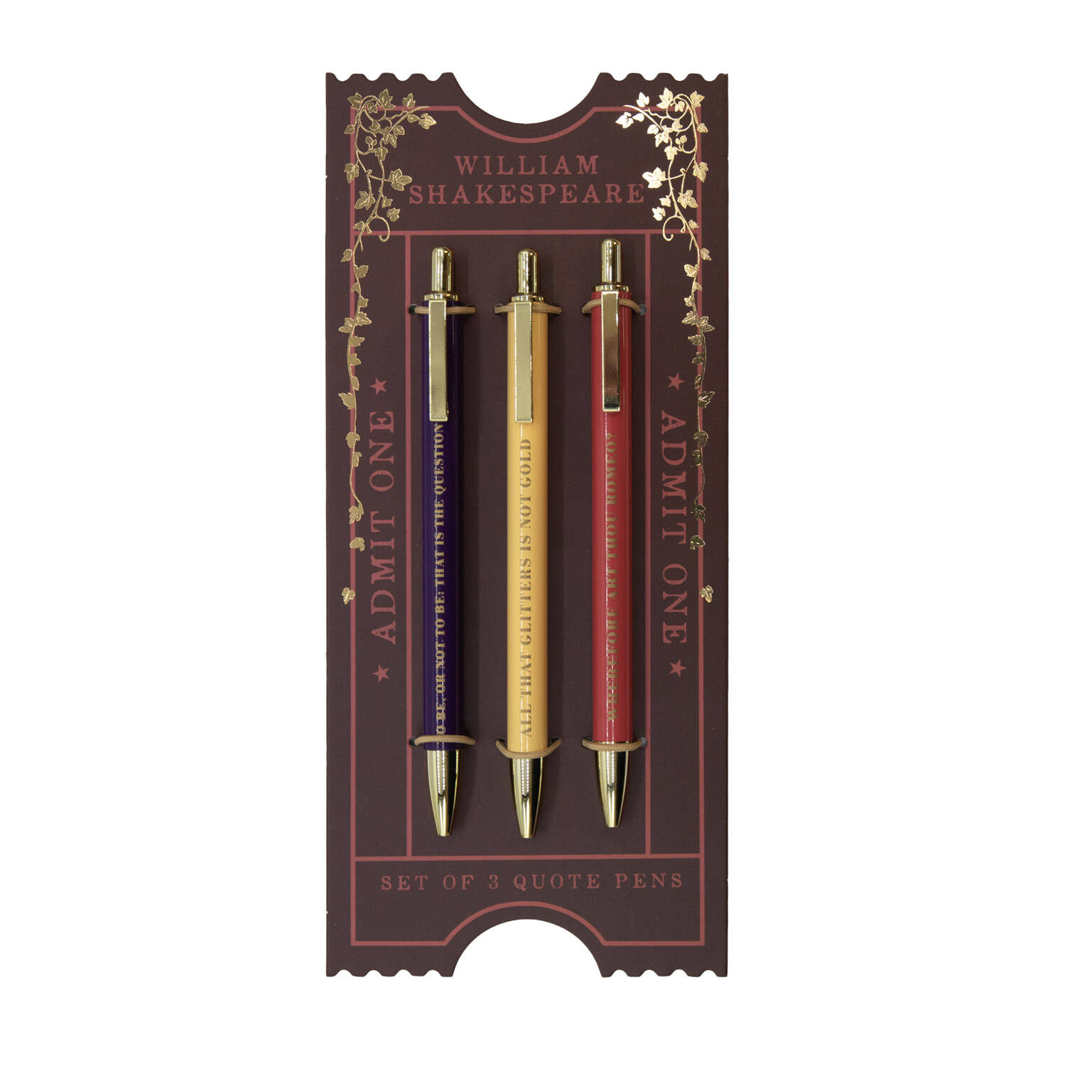 Píšte s vtipom a múdrosťou Shakespeara. Táto elegantná sada troch kovových guľôčkových pier je zdobená citátmi z najznámejších diel tohto veľkého dramatika, vytlačenými zlatou fóliou: “To be or not to be, that is the question,” “All that glitters is not gold,” a “Wherefore art thou Romeo.”. Perá sú vyhotovené v farebnej sade s akcentami zlatej farby. Sú ideálne na písanie denníka, poznámok alebo ako darček a predstavujú premyslenú pamiatku pre milovníkov kníh aj nadšencov Shakespeara.