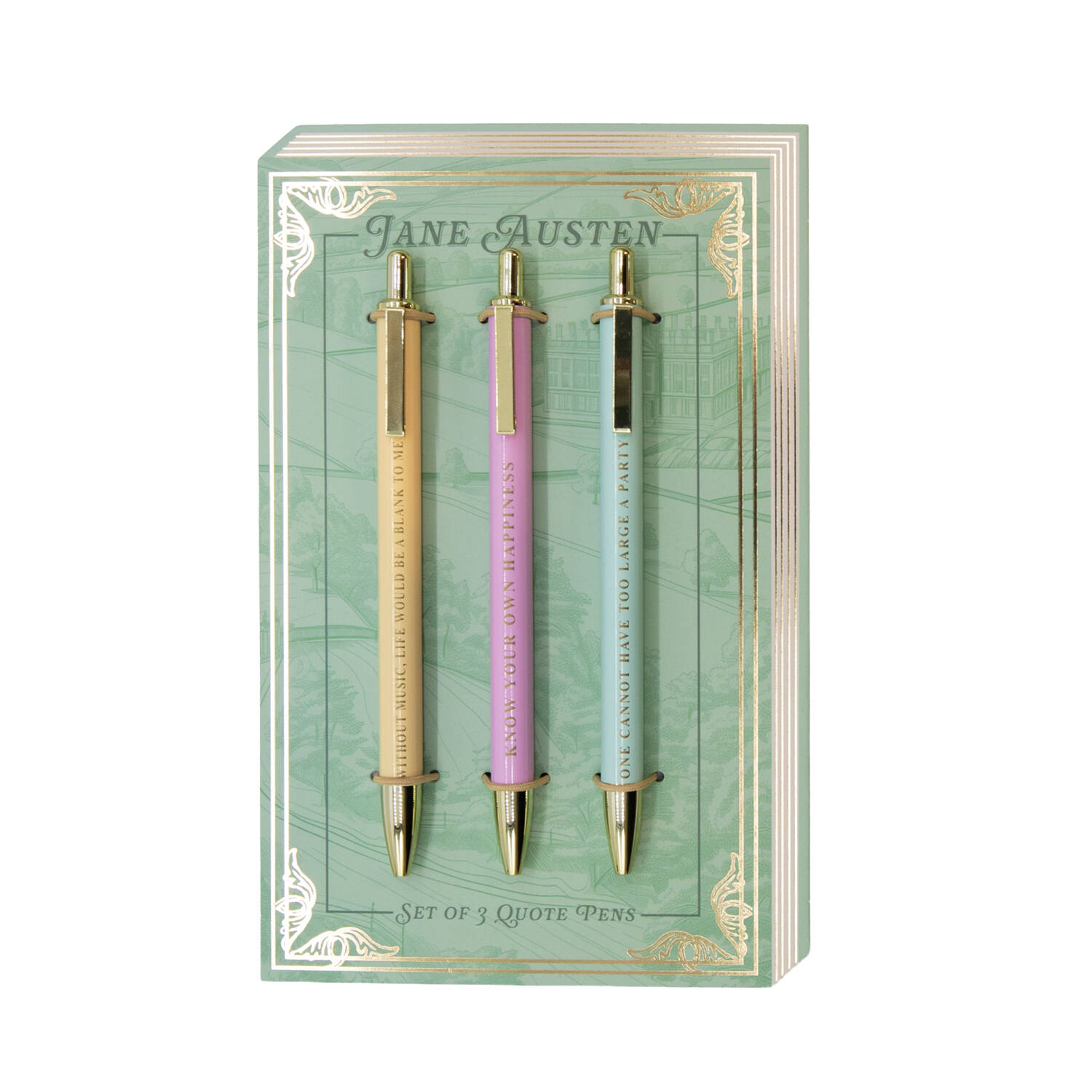 Vneste do svojho písania vtip a múdrosť Jane Austenovej s touto elegantnou sadou troch kovových guľôčkových pier, z ktorých každé je potlačené obľúbeným citátom v lesklej zlatej fólii. Medzi citátmi nájdete: “Without music life would be a blank to me,” “Know your own happiness,” and “One cannot have too large a party.” Tieto perá sú vyhotovené vo farebnej sade s akcentami zlatej farby. Sú ideálne na písanie denníka, robienie si poznámok alebo ako darček a predstavujú premyslenú pamiatku pre obdivovateľov Austenovej a milovníkov klasickej romantiky.
