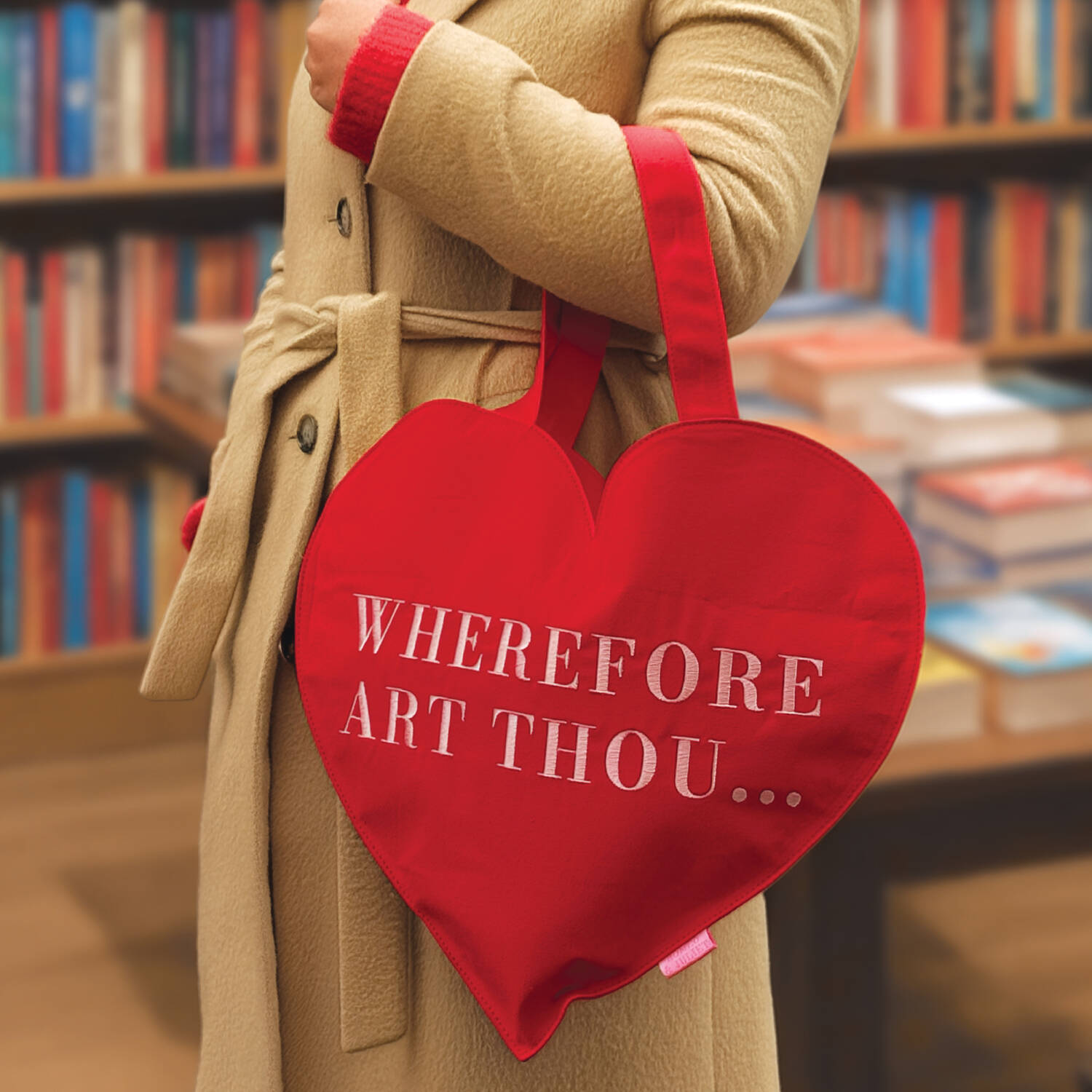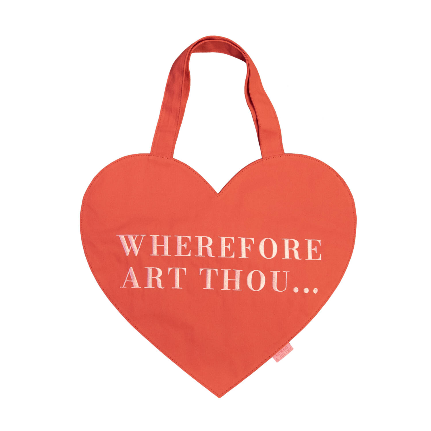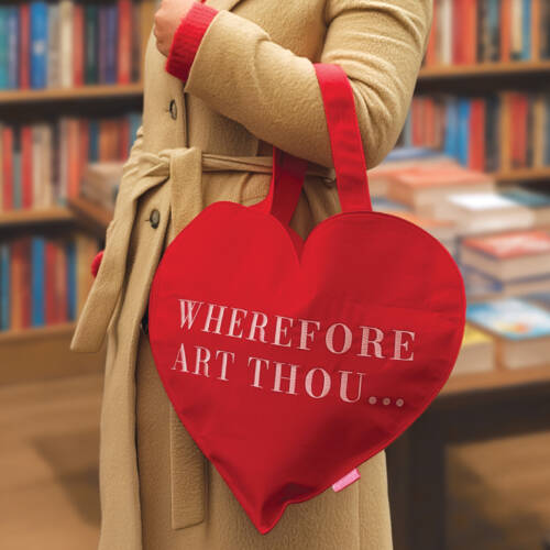Nechajte sa unášať romantikou kamkoľvek pôjdete s touto červenou taškou z bavlneného materiálu, inšpirovanou Shakespearovým dielom Romeo a Júlia. Taška v tvare srdca s celoplošnou podšívkou je zdobená výraznou ružovou výšivkou s nadčasovým nápisom „Wherefore art thou“. Vďaka širokým uchám, ktoré zaisťujú pohodlné nosenie, je táto taška praktická aj poetická – ideálna na knihy, zápisníky alebo každodenné nevyhnutnosti. Je to suvenír pre milovníkov Shakespeara i snílkov.