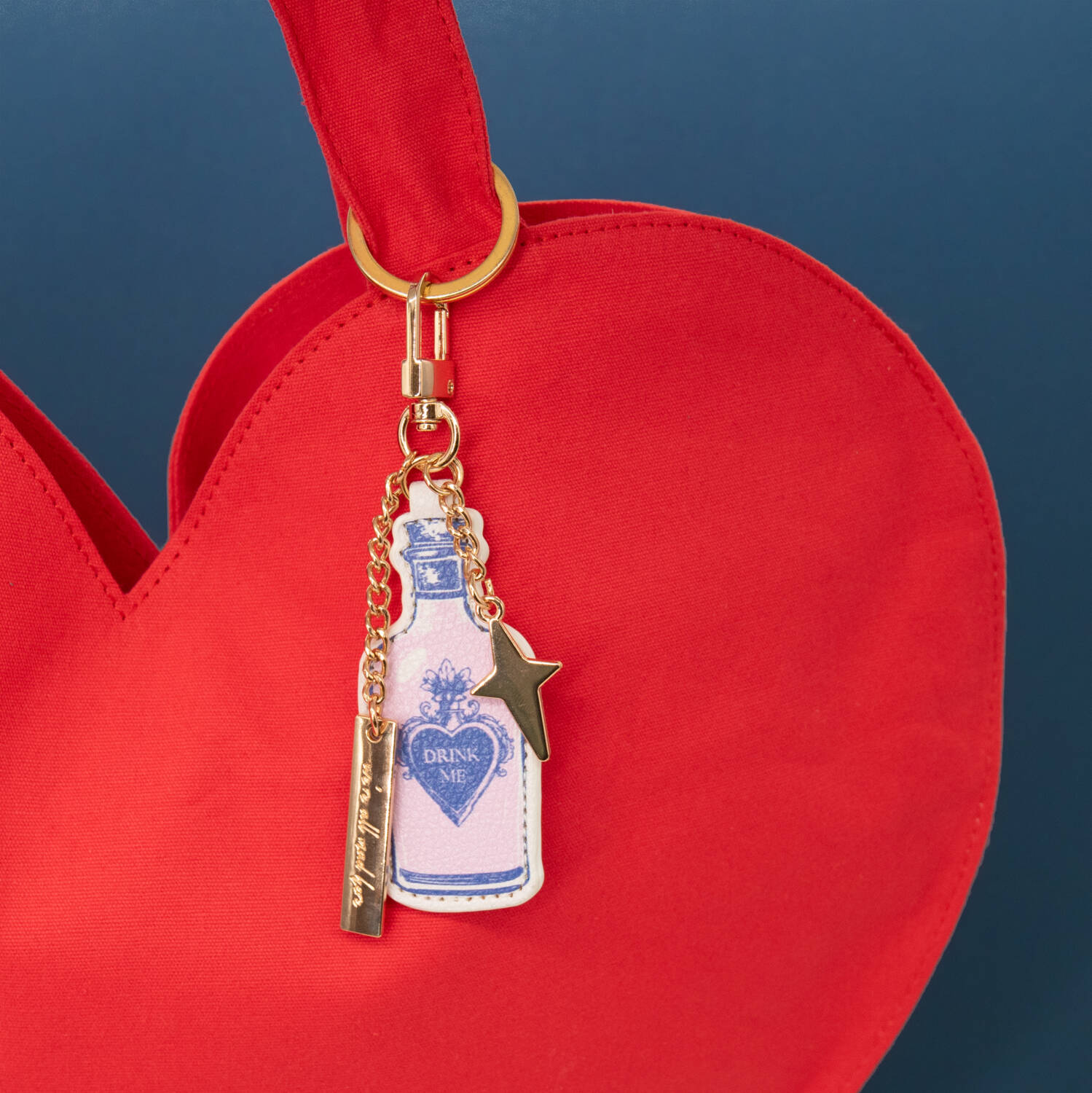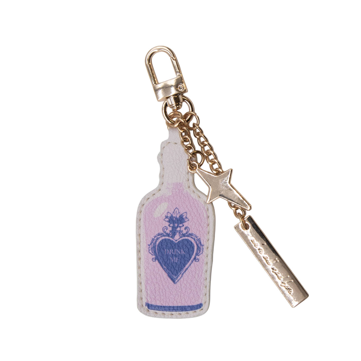 Vstúpte do sveta zázrakov s týmto hravým obojstranným príveskom na tašku z polyuretánu, inšpirovaným dielom Lewisa Carrolla Alica v krajine zázrakov. Prívesok s nápisom „Drink Me“ / „Eat Me“ je doplnený trblietavým zlatým príveskom v tvare hviezdy a kovovou visačkou s nápisom „We’re all mad here“. Tento originálny doplnok s karabínkou na kľúče dodá náznak zvedavosti a fantázie každej taške alebo kabelke.