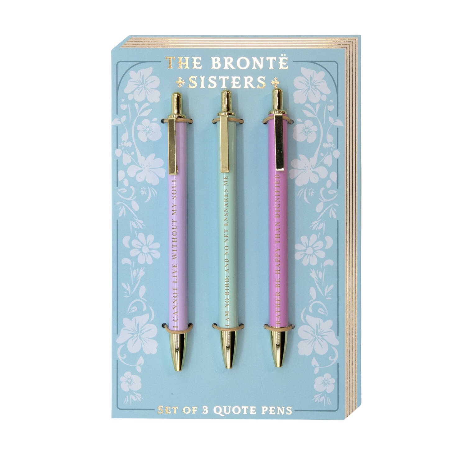 Nech vás vášeň a sila inšpirujú pri písaní vďaka tejto elegantnej sade troch kovových guľôčkových pier, ktorá oslavuje nezabudnuteľné slová sestier Brontëových. Na každom pere je vytlačený milovaný citát v lesklej zlatej fólii: “I cannot live without my soul,” “I am no bird; and no net ensnares me,” a “ rather be happy than dignified.” Tieto perá sú vyhotovené vo farebnej sade s akcentami zlatej farby. Sú ideálne na písanie denníka, poznámky alebo ako darček a predstavujú premyslenú pamiatku pre čitateľov, ktorí si cenia nadčasové diela sestier Brontëových.