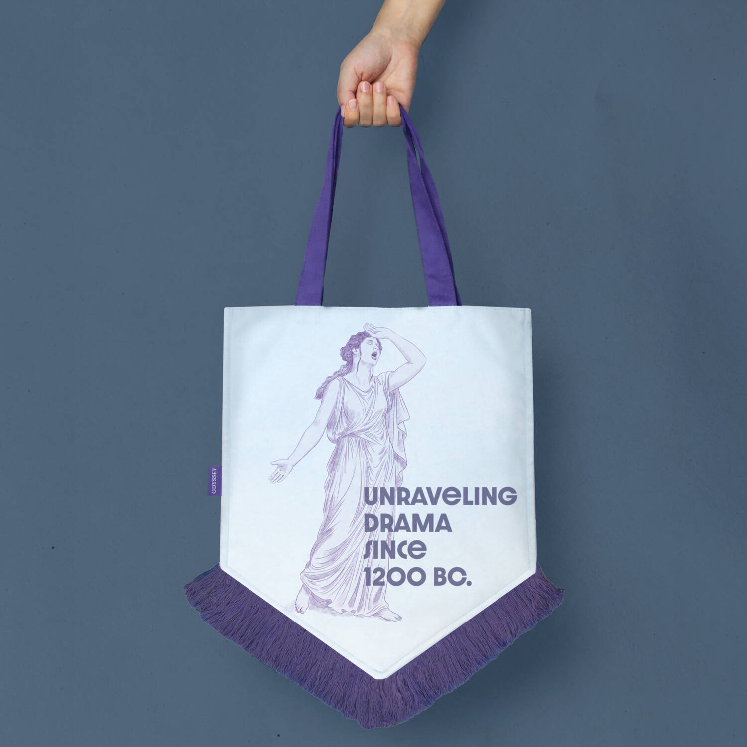 Vyrazte do sveta s mýtickým šarmom a nádychom starovekého dramatizmu s touto taškou z bavlnenej zmesi, inšpirovanou eposom Odysea. Taška je vyrobená z pevnej bavlny s gramážou 220 g/m² a zdobená textúrovanými strapcami. Oslavuje tak epické príbehy a nadčasovú túžbu po cestovaní, ktoré sú typické pre klasické rozprávanie. S potlačou na prednej a zadnej strane s nápisom „Unraveling drama since 1200 BC“ je určená pre čitateľov a fantáziou nadaných ľudí, ktorí nosia vo svojich srdciach celý svet.